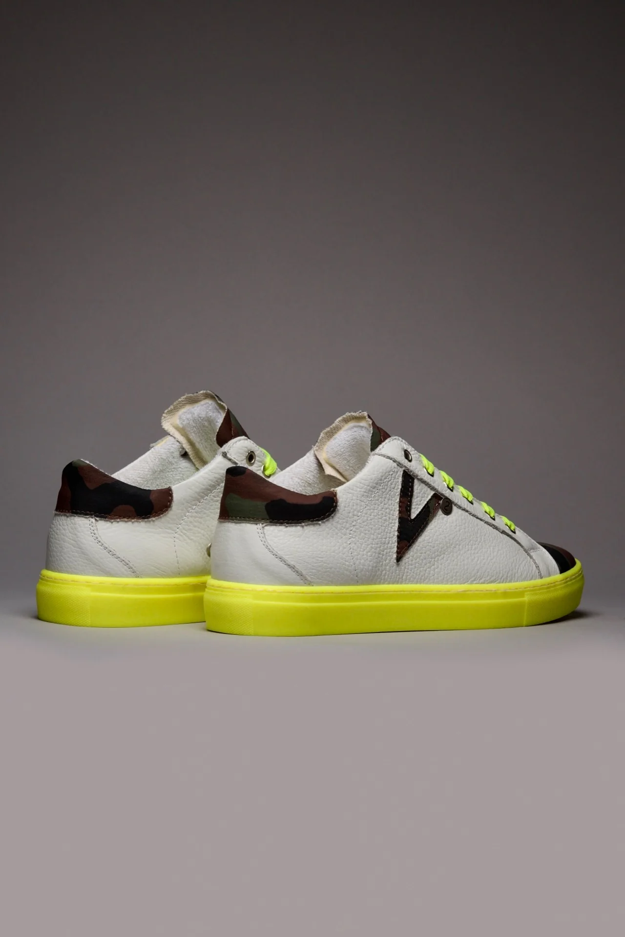 A completare il suo look ci pensano gli immancabili dettagli: lacci colorati, retro e inserto laterale in pelle, linguetta in tessuto Camouflage e suola colorata a contrasto.